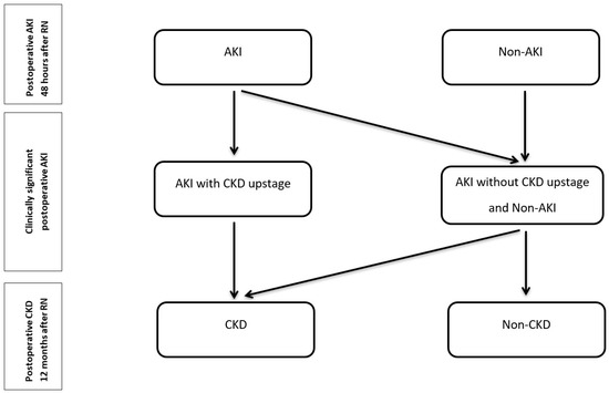 - Cho, A.; Lee, J.E.; Kwon, G.Y.; Huh, W.; Lee, H.M.; Kim, Y.G.; Kim, D.J.; Oh, H.Y.; Choi, H.Y. Post-operative acute kidney injury in patients with renal cell carcinoma is a potent risk factor for new-onset chronic kidney disease after radical nephrectomy. Nephrol. Dial. Transplant. Off. Publ. Eur. Dial. Transpl. Assoc.—Eur. Ren. Assoc. 2011, 26, 3496–3501. [Google Scholar] [CrossRef] [PubMed]