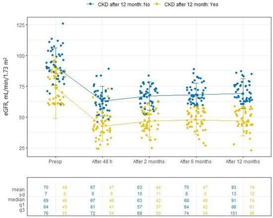 The primary and postoperative eGFR means were lower in the CKD than in the non-CKD patients group, see Figure 3. All perioperative and postoperative laboratory data of CKD and non-CKD patients are summarized in Supplementary Table S1: CKD and non-CKD patients’ perioperative and postoperative laboratory data.