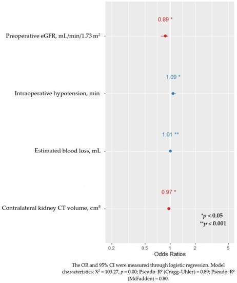 With each 1 mL estimated loss of blood (OR 1.01, 95% CI 1.00–1.02, p < 0.001) during RN, it was evaluated that a longer IOH was the main predictor of postoperative CKD with an OR of 1.09 (95% CI 1.02–1.17, p < 0.01). Having a higher eGFR and contralateral kidney CT volume before RN were related with a decreased risk of postoperative CKD; the ORs were 0.89 (95% CI 0.80–0.98) and 0.97 (95% CI 0.94–1.00) and p-values were 0.02 and 0.04, respectively. This multivariable analysis is presented in Figure 4.
