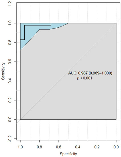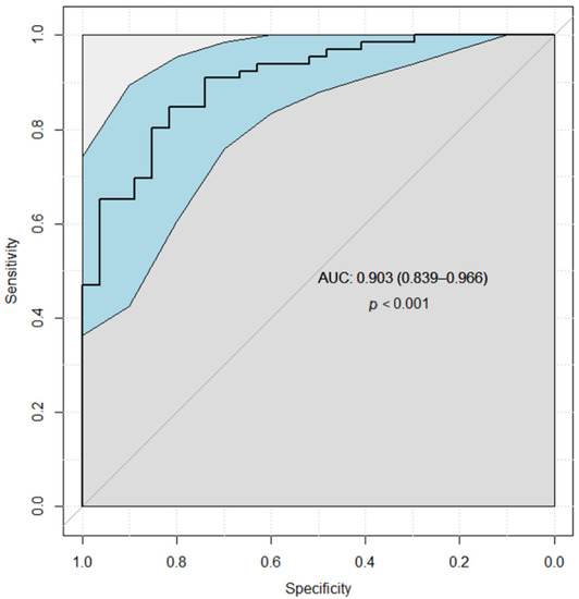 This logistic regression model’s ROC analysis showed significant sensitivity of 90.1% with specificity of 66.7% as presented in Figure 8.