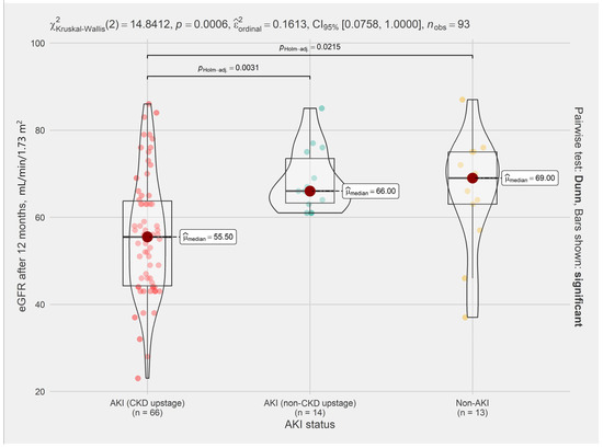 Dunn’s test (Figure 6) revealed that non-AKI and AKI without CKD upstage have no impact on eGFR 1 year after RN except clinically significant AKI (effect size (g = −1.08), p < 0.001).
