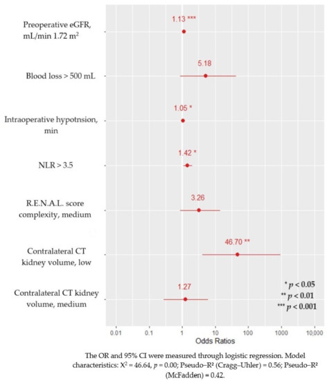 The preoperative eGFR and age between AKI and non-AKI participants included in the cohort were not significantly different, 86.0 (70.2; 94.8) vs. 86.0 (74.0; 89.0) mL/min, p = 0.687 and 62.5 (50.2; 72.8) vs. 62.0 (54.5; 65.5) years, p = 0.71. A longer IOH time and higher loss of blood during RN was found in AKI patients, 20.0 (0.0; 43.8) vs. 0.0 (0.0 to 17.5) min p = 0.024 and 282.5 (201.2; 530.0) vs. 220.0 (162.5; 275.0) mL p = 0.044, respectively. Moreover, we found that AKI patients had a higher NLR mean, 4.1 (3.1; 6.7) vs. 2.7 (2.3; 2.9), p < 0.001.