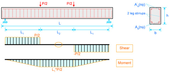 A little later (1983), Bazant et al. [7] used a theoretical formulation (using the energy criterion of fracture mechanics as well as the strength criterion) to estimate crack width and spacing in RC elements under pure tension. The proposed theoretical formulation was confirmed by experimental results obtained by other authors. It should be emphasized that the real unknown in the study was the crack spacing, which was found to be a function of several factors, including the axial strain of the bars, bar spacing, bar diameter, fracture energy of concrete, and its elastic modulus. Since then, it became reasonably well-known how to calculate the width once the crack spacing is determined. The crack width calculation used in this study was similar to the expression used in European Concrete Design Standard EC2 [1]. The adaptation for beams subject to bending consisted of determining an area around the tensile reinforcement where the stress field would be assumed to be uniform. The results then determined were, however, updated, namely, the deformation for the onset of cracking and the minimum spacing between cracks. The study did not consider the presence of stirrups in the RC beams.
