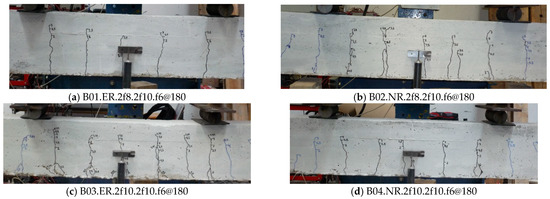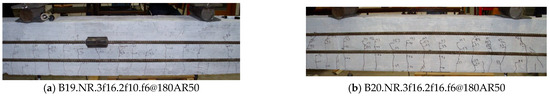 Regarding Beams B09 and B10 (stirrups spacing 180 mm apart), Figure 4e,f show that the main cracks are positioned in the location of the stirrups. Secondary cracks form (posteriorly) between the main cracks.