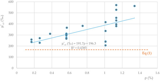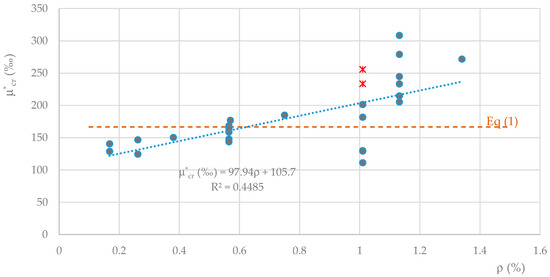 As the first hypothesis, Figure 10 shows the graph of reduced moments evaluated for beams considered as a function of reinforcement ratio ρ. The cross markers represent Beams B19 and B20, where the axial force at the beginning of cracking was not insignificant (Ncr ~ 51 kN). The remaining beams are represented by circle markers. The indicated trend line was evaluated only for these beams. In this figure, the line corresponding to the cracking moment determined by Equation (1) is also represented, assuming the proposal indicated in Structural Concrete [26], i.e., that fct is determined by concrete flexural tensile strength fctm,fl (Equation (2)). Considering the value of R2 (determination coefficient), there is a significant dispersion of results for the different beams. This dispersion is more evident in tests with normally reinforced beams (ρ > 1%). Anyway, the trend line clearly shows the influence of tensioned reinforcement on cracking; the cracking moment in well-reinforced beams (ρ ~ 1.3%) reaches twice the value of insufficiently reinforced beams (ρ ~ 0.2%). Considering the value of the cracking moment estimated by Equation (1), it appears that, for weakly reinforced beams (ρ < 0.6%), the estimate is insecure, whereas the estimate is conservative for normally reinforced beams (ρ > 0.6%). This conclusion depends on the assumed value for fct.
