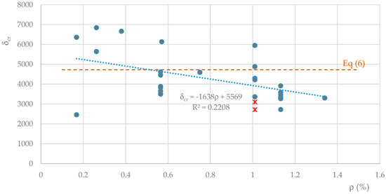 For the considered beams, it is presented in Figure 12 the values of the quotient δcr = L/dcr as a function of the tensile reinforcement ratio ρ; L = 2L1 + L2 represents the free span of the beam. Remember that this coefficient δcr is recurrent in the regulations for checking deformation (Deflection control) within the scope of the serviceability limit states SLS. Once again, the results of Beams B19 and B20 are highlighted with asterisk marks. The trendline does not consider these values. The horizontal line represents the average of the theoretical values (4722; STDV = 497) determined from Equation (5). The average value of the experimental results is 4227 with a standard deviation STDV = 1221. This dispersion of results is clearly evident in the reduced value of the determination coefficient R2. Only the trendline is illustrated because there is a high number of samples. In any case, there is a tendency for dcr to increase (slightly) as the tensile reinforcement ratio increases. This result, although it cannot be definitively assumed, is curious, nonetheless. In fact, cracking starts when the tensioned concrete reaches the ultimate strain. Now, if there is a greater amount of tensile reinforcement, it motivates higher tensile forces, which will be balanced in the compressed part with greater strains and an inferior neutral axis, i.e., greater curvature of the cross section. That is, the upper sag of the beam. In the absence of a strong dependence, it can be stated that, as the amount of reinforcement increases, there is a slight increase in the cracking deflection.