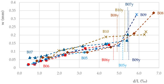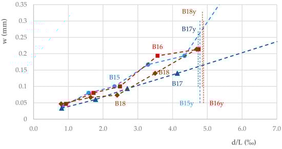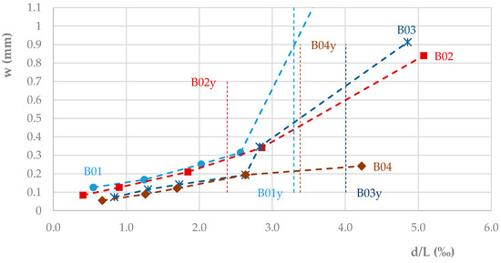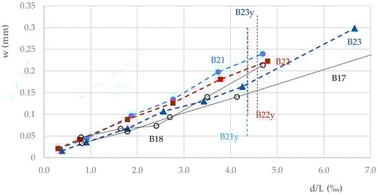 Figure 18 presents the w-values of the beams in Group VII (As = 3ϕ12). Only Beam B23 was subjected to passive axial restraint: Ncr = 0.6 kN and Ny = 60.0 kN. The visualization of cracking started at d/L ≈ 0.34‰, with w = 0.02 mm. In turn, the yield occurred for equivalent amounts: d/L ≈ 4.4‰, with w ≈ 0.21 mm. Regarding the beams of Groups III and IV (As = 3ϕ16), yielding occurs earlier (smaller deflection) and with higher w.