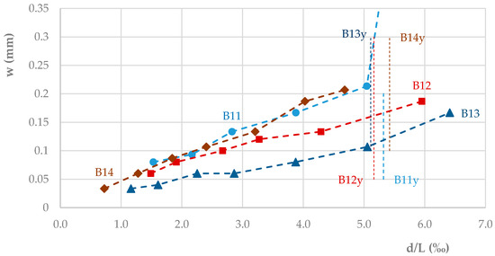 Figure 15 presents the crack width values for the beams in Group IV. These beams, with tensile reinforcement equivalent to those of Group III, were tested with axial restraint and were about 1 year old at the time of testing. As seen earlier, the effect of axial restraint on crack initiation is negligible (Ncr < 0.5 kN), but it becomes more significant as the beams approach yield (Ny(B11–B13) < 31 kN and Ny(B14) ≈ 54 kN). However, its impact is not such as to condition the conclusions in terms of deformations. The visualization of cracking started at a deflection ratio of d/L ≈ 1.1‰, with a crack width of w = 0.052 mm. These crack width values are higher than those determined for the beams in Group III. In turn, the yield occurred for equivalent amounts: d/L ≈ 5.2‰, with w ≈ 0.18 mm. These results suggest that the difference in age between the beams tested at one month and those tested at one year old did not significantly affect the evaluation of crack width.