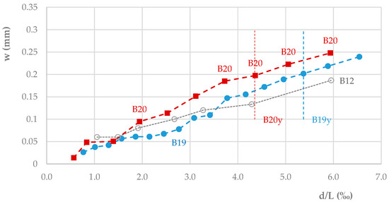 The w-values of the beams in Group VI (As = 3ϕ16) are shown in Figure 17. These beams were tested at about 2 years old. Here, the axial constraint was initially activated: Ncr ≈ 51 kN and Ny ≈ 120 kN. It is also important to point out that it was used a self-compacting concrete with shrinkage reducing admixtures. The lower w-values of Beam B19 (A’s = 2ϕ10) relative to Beam B20 (A’s = 2ϕ16) confirm that less compressive reinforcement results in lower w-values and later yielding. For these beams, cracking visualization started at d/L ≈ 0.67‰, with w = 0.020 mm. In turn, the yield occurred for equivalent amounts; d/L ≈ 4.9‰, with w ≈ 0.20 mm. Regarding the previous results (Groups III and IV), the comparison must consider the axial restriction. In any case, yield occurs for a similar sag, with a deviation of less than 6.5%; the w-value is relatively higher, with about 11% deviation.