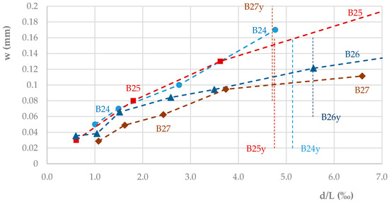 The w-value results from the average of the three (if any) highest recorded values; in Beams B24–B27, the smallest, only two values were used. The crack widths were measured with the aid of a crack width microscope (40× magnification) at the level of the tensile reinforcement. For each beam, the first point represents the instant when it was possible to visualize the cracks. It was decided not to include, in these graphs, the starting point of cracking. The vertical lines represent the (supposed) yield point of the reinforcement. In these figures, it is important to understand the influence of the different parameters in terms of crack width in beams subjected to bending.