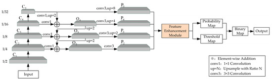 Finally, in order to reduce the overlap effect of up-sampling, a 3 × 3 convolution was attached to , , , and . In order to obtain the same size of the feature map where all were 1/4 of the original size, a corresponding number of up-sampling repeats were added after convolution to obtain the four final feature maps for , , , and . The details were calculated with Equations (3)–(6):