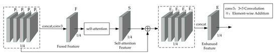 As shown in Figure 2, the four features , , , and were fused by the concat operation. Then, a 3 × 3 convolution was appended for dimensional transformation to obtain the fused features F. After that, the self-attention calculation was performed, which was calculated by using shifted window to obtain a self-attention feature S. Then, , , , and were summed with S by element, respectively, and , , , and were correspondingly obtained. A concat operation was performed on , , , and for feature fusion to obtain a final enhanced feature E. The specific calculation formulae are given in Equations (7)–(10):