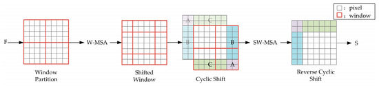 However, the number of windows was larger than that previously, and the computation volume increased. The size of each window was not fixed, so it could not be computed in parallel. In order to solve this problem, the window was fully filled to its original size by using cyclic shift, which can be seen in Figure 3. However, cyclic shift will cause some windows to be composed of some actual non-adjacent sub-windows inside, which need to be masked to ensure that they do not interfere with each other when calculating the multi-headed self-attention. Finally, each pixel in the feature map was then reset to its original position by the reverse cyclic shift operation to obtain the self-attention feature S.