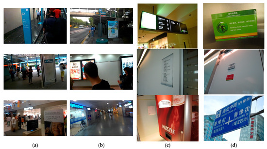 Some samples of the datasets. (a) From the ICDAR2015 training set; (b) from the ICDAR2015 test set; (c) from the MSRA-TD500 training set; (d) from the MSRA-TD500 test set.