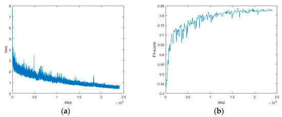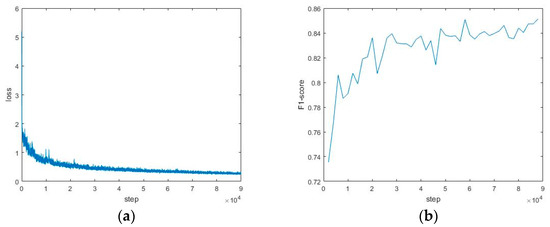 Using the pre-trained model obtained on the SynthText dataset and considering that the MSRA-TD500 training set was small, the training sets from MSRA-TD500 and HUST-TR400 were combined as a new training set. Then, we evaluated based on the test set of MSRA-TD500 at every 2000 iterations, and the best evaluated model was saved after the training was completed. The training and testing curves of the MSRA-TD500 dataset are shown in Figure 6.