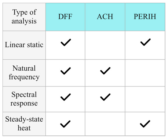 Four types of analyses were performed using Strand7 to evaluate the performance of DFF, ACH and PERIH in different conditions. These analyses are linear static, natural frequency, spectral response, and steady-state heat.
