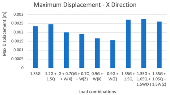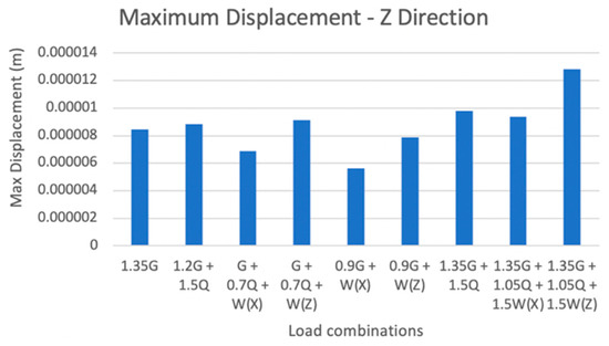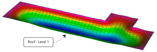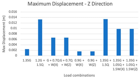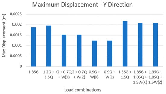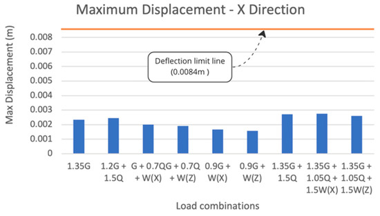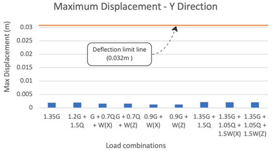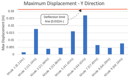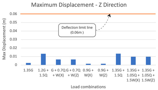 It was observed that the deflection of the structure complies with the standard, even at higher frequencies. Moreover, a minimal gap between the deflection and limit was observed caused by the dead load and wind load in the Z direction, influencing mode 6 . This is important to ensure the stability of the structure during dynamic loadings, such as seismic loads.