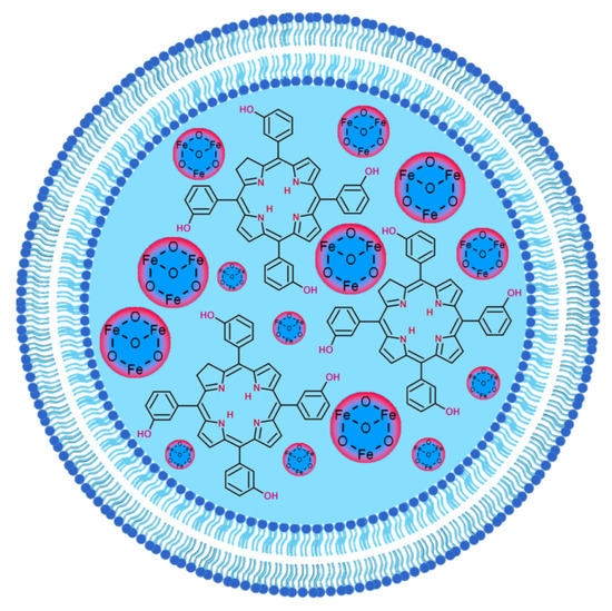 Magnetic nanoparticles constitute one of the most frequently used metallic nanoparticles as drug delivery carriers. The surface coating for magnetic nanoparticles can be polyvinyl alcohol (PVA), dextran, polyethylene glycol (PEG), polyvinylpyrrolidone (PVP), or chitosan, which protect them from instant clearance within the bloodstream. There are many examples of magnetic nanoparticles with various chlorin conjugates with potential medical applications. An interesting example in this regard was proposed by Di Corato et al., who prepared liposome–cargo particles (Figure 3) bearing iron oxide nanoparticles and a chlorin-based PS—temoporfin. Such a combination can be considered a further development of Foscan, a commercially available liposome formulation. Due to the combination of iron oxide nanoparticles and temoporfin, such a combination could be applied for magnetothermal treatment (MHT) and PDT [16]. The authors confirmed the stability of nanoparticles within 30 days of storage and later tested it, using an in vitro model, against ovarian cancer cells. The maximal iron uptake was achieved after a 1 h incubation, reaching 15–20 pg per cell. The studies indicated that iron nanoparticles were deposited in the membrane compartment and did not cross this barrier into the cytoplasm. Foscan crossed lipid bilayers and localized inside the cells due to its hydrophobic nature. The authors examined the potential of the combined magneto-phototherapy. They noted that only 10% of the cell population survived when treated with the magnetic field, whereas only 1% persisted when PDT was applied alone. Combining these modalities provided the complete elimination of the initial cell culture population. In parallel, the authors overlooked the impact of nanoparticles on cells when they were not activated. Additionally, the high potential of this liposome cargo was confirmed in in vivo trials using a mouse model. Particles were injected into the tumor, where the majority remained. Non-activated particles did not reveal any impact on the tumor, whereas turning on magnetotherapy and phototherapy alone induced partial cancer regression. Total regression was noted when both therapies were combined. It is believed that magnetotherapy potentiates PDT by increasing the tissue temperature. A higher temperature is the cause of blood vessel extension, thus improving blood flow through the tumor. Increased blood flow provides a higher partial molecular oxygen content in the tumor and its neighborhood. It is essential because molecular oxygen is a substrate for the excited PS in the photodynamic reaction, which leads to the formation of singlet oxygen—a highly reactive agent responsible for cancer cell death [16].