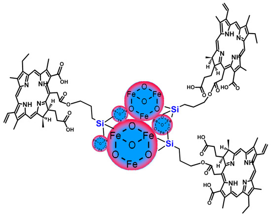 In another study, the theranostic properties of metallic nanoparticles bearing a PS were assessed by Huang et al., who developed nanoparticles consisting of iron oxides (Fe3O4) and Ce6 bonded together via an aliphatic linker (Figure 4) [17]. The authors confirmed the formation of singlet oxygen under particle irradiation. The system was applied in in vitro and in vivo studies based on gastric cancer cells and tumors (MGC803). The nanoparticles, at a concentration of 42 µM and excited with light at 632.8 nm with an energy density of 30 mW/cm2 for 10 min, caused a decrease in cancer cell viability to <20% of the initial population. Moreover, the nanoparticles enabled cancerous visualization via NIR fluorescence and magnetic resonance imaging (MRI). Particles produced reasonable magnetic responses useful for MRI imaging, which was confirmed in a trial with a nude mouse model [17].