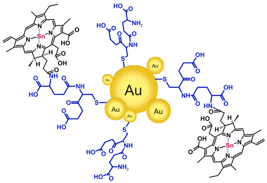 Chemical structure of the conjugate consisting of tin chlorins (black), glutathione linkers (blue), and gold nanoparticles (yellow) [31].