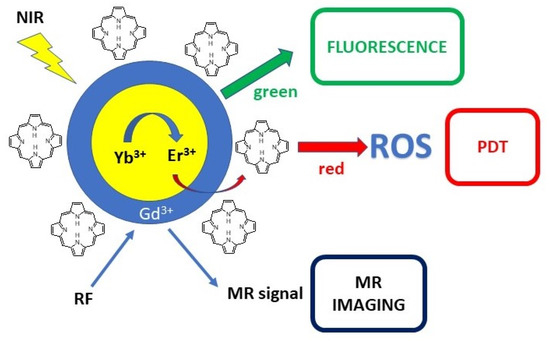 Upconverted nanoparticles (UNs), consisting of host lattices of ceramic materials embedded with transition metals, actinide, or lanthanide ions, such as Yb3+, Er3+, and Tm3+, display a unique feature that is based on a process of the emission of light at a shorter wavelength in comparison to the excitation wavelength after the sequential absorption of two or more photons [46]. The use of upconversion nanoparticles brings one significant advantage—created material can be irradiated with near-infrared (NIR) wavelengths. The energy absorbed is converted and emitted as fluorescence in the visible or UV region upon NIR irradiation. The desired emission wavelength of the photosensitizer can be triggered by appropriately selected doped upconversion nanoparticles. Matching the emission and excitation wavelengths of the two components so that they overlap is critical to unleashing the cascade of energy transfers (Figure 6).