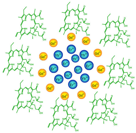 Hexagonal NaYF4:Yb,Er/NaGdF4 core-shell nanoparticles bearing Ce6 were proposed by Park et al. for cancer diagnosis and treatment (Figure 7) [48]. Ce6 molecules were incorporated into the hydrophobic layer surrounding core-shell nanoparticles, which allowed to enhance their water solubility. Moreover, the carboxy groups present in the Ce6 molecules were applied in their conjugation with amino-modified particles with amide bond formation. The mechanism of action of the discussed nanomaterial was based on an upconverting phenomenon. Ytterbium was responsible for light absorption at the wavelength of 980 nm and energy transfer to the Erbium, which produced fluorescence. In addition, the PS Ce6 molecules were excited with the red light emitted by Erbium, which produced singlet oxygen responsible for cancer cell death. A nanoparticle shell bearing gadolinium ions was responsible for the magnetic resonance signal. The advantage of optical imaging was its sensitivity and the MRI spatial resolution. The authors performed in vitro and in vivo experiments, and for both biological models, noted the high imaging potentialwith significant green emission within the tumor up to 6 h after injection. The authors also noted high biocompatibility with no negative response up to 0.25 mg/mL of rare earth metals. The assessed half-time of designed nanoparticles equaled 21.6 min, and they accumulated in the liver and spleen at a low level. The nano particles applied in vitro against cancer U87MG cells and in vivo, irradiated with light at 980 nm,revealed significant cell death and tumor growth inhibition [48].