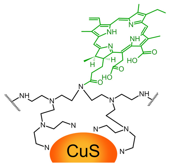 Chemical structure of the CuS nanoparticle (orange) surfaces, which were modified with polyethyleneimine (black) and Ce6 (green) [50].