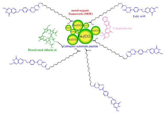 The metal–organic frameworks with high flexibility and porosity can be synthesized by combining metal-containing subunits (inorganic clusters) and organic linkers (carboxylates, imidazolates, and phosphonates). Such systems constitute promising drug delivery carriers, as well as theranostic agents. The MOF nanoparticles bearing Ce6 and camptothecin (Cam) for photodynamic therapy and chemotherapy as multimodal agents were presented by Liu et al. (Figure 9) [65]. Moreover, the obtained nanoplatform was attached to folic acid (FA), thus facilitating targeted delivery. The authors fabricated the nanoagent with the Ce6 derivative triggered by cathepsin B, an enzyme present mainly in cancerous cells. Ce6 linked with the peptide—a substrate for cathepsin B—did not reveal any photodynamic activities, but after cutting the peptide moiety off and releasing Ce6, the photodynamic properties were turned on. In the in vitro experiments, Liu et al. showed that the nanoagent was efficiently delivered into HeLa cells compared to that with HaCaT (immortalized human keratinocytes) cells. It is known that HeLa and many other cancer cells possess folic acid receptors, unlike non-cancerous HaCaT cells. The authors presented the targeted delivery of Ce6 into the cells, which was indicated by photosensitizer fluorescence turned on by intracellular cathepsin B. The intracellular singlet oxygen production was indicated with Singlet Oxygen Sensor Green. The cytotoxic assessment experiments showed that combined chemo- and photodynamic therapy influenced the apoptosis of 99.27% HeLa cells upon light excitation (60 J/cm2 at 660 nm), while in the dark condition, only 35.17% of cells were eliminated. Interestingly, the same level of cancer cell death was achieved only for Ce6 MOF, loaded after 30 min of irradiation. Simultaneously, the experiments using cells without folic acid receptors were performed, and no activity was noted. In the in vivo trials, the usability of the nanoagent was tested with the HeLa tumor mouse model. The developed MOF preferentially accumulated in the tumor within 24 h after intravenous injection. In the tumor, Ce6 was triggered by cathepsin B and emitted strong fluorescence. A significantly higher decrease in the tumor volume was noted when treated with Cam-Ce6-pept-FA-MOF nanoparticles in comparison to that with Cam-FA-MOF or Ce6-FA-MOF [65].