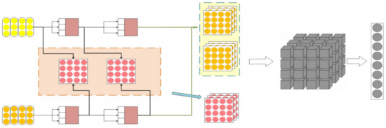 Next, the new matching matrix is aggregated with the two original matrices into a 3D matrix. As shown in Figure 6, the new matching matrix is obtained through the multiple attention modules in the blue box and aggregated with the original self-attention and cross-attention matrices to form a new 3D matrix. Finally, the features are extracted by using twice convolution and maximum pooling as follows: