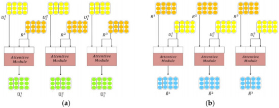 Shifted cross attention of multi-level granularity. (a) The granularity of utterance is used as the Q input to the Attentive Module, and the granularity of response is used as the K and V inputs to the Attentive Module; (b) The granularity of response is used as the Q input to the attentive module and the granularity of utterance is used as the K and V input to Attentive Module. Finally, two different granularities of cross-attention are generated.