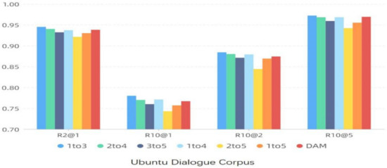 In order to validate the effectiveness of the improved methods, we compare the experimental results of the proposed model with several classical models. In addition to DAM, there are the SMN model and the stacked multi-head attention [48], both of which propose models applicable to the two datasets previously mentioned. SMN matches each utterance and response to construct a 2D similarity matrix, and in addition to matching at the word embedding level, it uses GRU to obtain a granularity at the sub-sequence level and then obtains the utterance-response similarity matrix at that level of granularity, and finally extracts the matches by convolution and pooling as well. The stacked multi-head attention is optimized on the basis of DAM by using the multi-head attention to capture the semantic dependencies between the layers, thus obtaining a multi-layer granular representation with more information than DAM hierarchical capture approach.