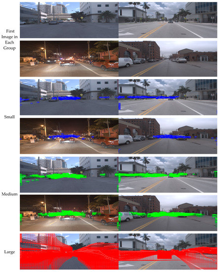 The accuracy results for the Argoverse dataset [32] divided by vehicle size are listed in Table 1. In this study, small, medium, and large vehicles are not arbitrarily chosen, rather, the 39,343 images of the Argoverse dataset are arranged in the order of vehicle sizes for the Ground Truth (GT) dataset and split into an even 33% ratio for each size, named small, medium, and large. AP0.5 is the Average Precision (AP) value when the Intersection over Union (IoU) of the detection box and GT are more than 0.5, and thus, AP0.5-Small, AP0.5-Medium, and AP0.5-Large mean the accuracy of small, medium, and large vehicles, respectively. As shown in Table 1, the accuracy of small vehicles is relatively low compared to the accuracy of large vehicles; this difference in accuracy increases with a decrease in image resolution. This needs to be focused on to improve the accuracy of overall vehicle detection.