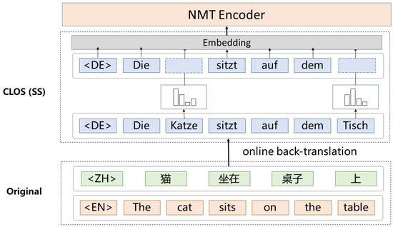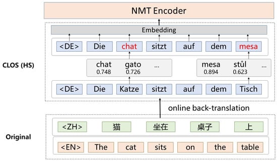 Inspired by constructive learning, recent work generates code-switched samples with multilingual dictionaries or through word alignment models [26,27], trying to close the representation gap between different languages. However, these data augmentation methods need other explicit cross-lingual dictionaries (which is hard to obtain for zero-shot language pairs) or additional models such as MUSE [41] (which is computationally expensive). Differently, we propose to bridge the representation gap among different languages through cross-lingual online substitution (CLOS) without external resources. Given a training sample and a sampled intermediate language , we attempt to generate code-switched synthetic sentences rather than sentences of which all words are from language . Concretely, we investigate two variants in our work: