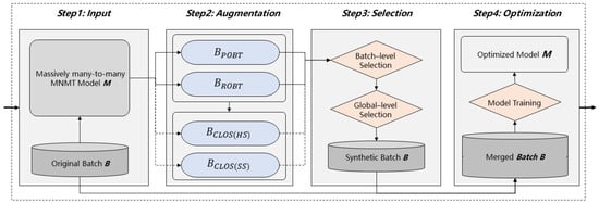To achieve optimal performance, we break down the whole training schedule into three stages: pre-training stage, augmentation fine-tuning stage, and substitution fine-tuning stage. The pre-training stage is equivalent to vanilla MNMT model training. In the augmentation and substitution fine-tuning stage, each training update contains four steps: input, augmentation, selection, and optimization, as illustrated in Figure 3. We utilize POBT and ROBT to generate synthetic augmented sentence pairs at both fine-tuning stages while only using the CLOS method at the substitution fine-tuning stage based on a better model initialization. The synthetic candidates are then selected with the batch-level selection criterion and successively sampled with the global-level selection criterion. Finally, the model M will be optimized on the merged datasets of both real and synthetic sentence pairs. The and are auto-regressively translated while and originate from them with substitution operations. Although the cost of our training schedule is more computationally expensive than vanilla MNMT training with two additional fine-tuning stages, it is comparable to MNMT systems with augmentation methods, such as ROBT, because we implement data augmentation in parallel and the fine-tuning stages cost much lower than the pre-training stage.