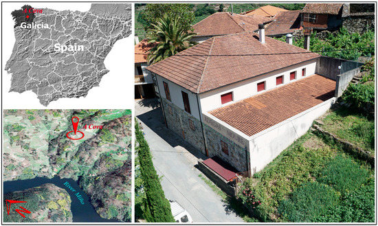 The experimental study was carried out in a winery built in O Saviñao (42°33′ N, 7°40′ W, altitude 399 m above Mean Seal Level (MAMSL) in the province of Lugo, Spain. The construction of the building dates back to 1920, when it was inaugurated for the production of local wines on a small scale. Since then, the building has undergone structural modifications and extensions, some of which were not documented. The results of these changes make its study of great interest, as it presents some singular structures and an important diversity of construction materials; the south façade is semi-buried to keep the AAT constant inside during all seasons of the year.
