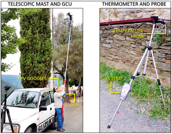Two methods were used to record the images of the cellar walls. Firstly, the FLIR VUE Pro R camera was installed on a UAS called Quasar™, manufactured by the company Dronetools™-Sevilla. This 4-rotor aircraft has an autonomy of approximately 1 h carrying a payload of 1.2 kg. The thermal camera was installed together with a Sony™ mirrorless RGB camera, ILCE α6000™, of 24 MPx. Both were mounted on a gimbal that kept them stabilised. The shots from the two cameras were synchronised, and the video transmitter installed on board allowed real-time video streaming to a monitor on the ground. Although the UAS always remained within the line of sight (LOS), the above system provided real-time video streaming as if the flight were being carried out in first-person view (FPV), ensuring in this way that the region of interest (ROI) was correctly captured. The second procedure, much simpler than the previous one, consisted of using a telescopic tool composed of three parts: the first was a telescopic lifting mast built with lightweight materials and a maximum working length of 7 m. This mast was employed to raise the FLIR B335 ground camera. At the extreme of the mast, the second part was attached: a ball-head mount locked the camera solidly in the desired position. Finally, the ground control unit (GCU) also included FPV glasses and a shoot button, which were commercial devices directly wired to the camera. The GCU was designed to be operated by only one person. Figure 4 and Figure 5 show the UAS and the manual system respectively. The use of UAS and ground cameras allowed the study to be carried out redundantly by comparing the results obtained using both cameras.