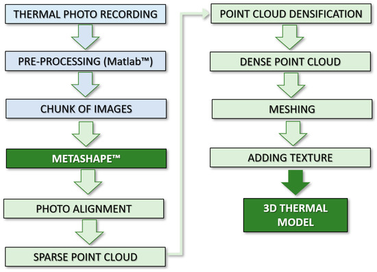 In the flowchart presented in Figure 6, the parts of the process that are carried out outside the photogrammetry software are coloured in blue and those that are carried out inside Metashape in green. It can be observed that after capturing the images, processing is required that does not apply to the RGB images. Although its mathematical foundations will be explained in detail in later sections, it can be anticipated that it mainly consists of the application of filters to eliminate noise or improve the focus of the images.