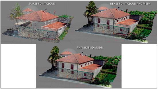 The meshing process consists of the creation of a mesh of triangular elements that join the points of the dense cloud. Once the mesh has been constructed, the three-dimensional model is visible. However, its surface does not have the texture of the real object or structure. In order for the final results to have the right texture, the pattern defined by the photographs is used. To facilitate the understanding of the process, Figure 7 shows 3 screenshots of the RGB model from the sparse point cloud to the final model.