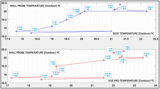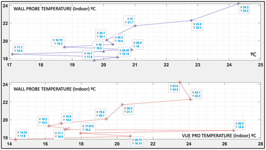 To check the validity of the study and to determine the accuracy that could be obtained by radiometric thermal imaging, the temperature values provided by the cameras at the reference points were compared with those obtained from the thermal probes in direct contact with the walls. The study was carried out for both cameras, inside and outside the envelope. Figure 10 and Figure 11 show, on the ordinate axis, the temperature measured by the probes, and on the abscissa axis, those obtained from the thermal images. Figure 10 shows the outside temperature results and Figure 11 shows the inside temperature results.