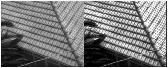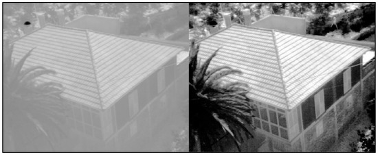 As can be seen from Figure 13, some thermal images have a very uneven histogram that prevents the detection of tie points during photogrammetric processing. This figure shows the original photo on the left and on the right the same image after redistributing the histogram. Although the improvement in the result is clear and the resulting 3D model is valid and shows the sharpest geometric details, it was not used, because the redistribution of the histogram showed some thermal anomalies more intensely, but diluted the edges of the affected regions on the roof of the building.