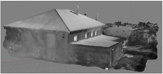 By selecting the correct value, as in the photographs in Figure 14, there is no variation in the thermal information collected by the image and the improved focus allowed 199 images to be oriented, compared to the 153 that Metashape aligned before processing. Although the resulting model is not comparable to that extracted from the RGB images (6000 × 4000 px vs. 640 × 512) the areas of the walls and roof where thermal anomalies were measured are easily identifiable and the pre-processing valid for any three-dimensional reconstruction using thermal imagery.