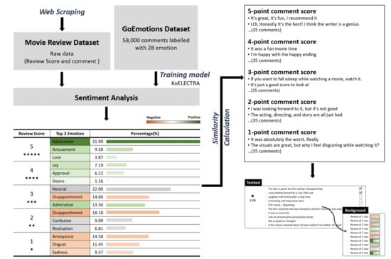 The crawled movie reviews of individual users consist of a comment with a star rating mapped to it. Since each individual has different criteria for grading comments and stars, we could not immediately use all the collected comments for the experiment. Therefore, we selected comments to represent a specific star rating score range. This was done by first mapping the sentiment frequently used in comments to each specific star rating section. Then, we selected comments containing a sentiment with high frequency of use as a representative review of the star rating section. The overall process is shown in Figure 1. The GoEmotions dataset is the largest manually annotated dataset of 58,000 English Reddit comments, labeled for 27 emotional categories [54]. To perform sentiment analysis on the collected review comments, we translated the GoEmotions dataset to Korean and then trained it through KoELECTRA [55] to create a sentiment analysis model. We applied the collected Korean movie review comment data to this model to analyze and identify sentiments.