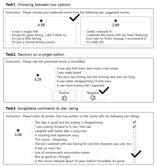 The interface and instruction of the testbed used in the user study; Task1 (top): Choosing between two options; Task2 (middle): Decision on a single option; Task3 (bottom): Acceptable comments to star rating.