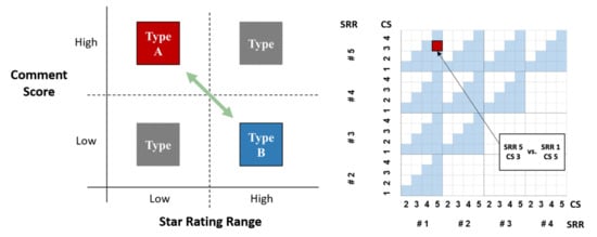 Every day, consumers compare products by star rating and comments. The selection between two things is an insightful, simplified version of the actual selection process for multiple options. The experiment task was to decide between two movies, each with a review (one one-to-five-star rating, plus three comments), as shown in Figure 2-Task1. We compared Type A (a low star rating, high scoring comments) and Type B (a high star rating, low scoring comments), as shown in Figure 3 (left). Selection of Type A can be interpreted as indicating that comments have a stronger influence than star rating, and conversely, for selection of Type B, vice versa. To account for all combinations of Type A and Type B scenarios, a total of 100 sample spaces were compared, as shown in Figure 3 (right). Look again at the example in Figure 2-Task1. The Type B (left) combination consists of a SRR #5 (4.5 < x ≤ 5.0) and comments of CS 3, and the Type A (right) combination consists of a SRR #1 (2.5 < x ≤ 3.0) and comments of CS 5. This example scenario corresponds with the red cell shown in Figure 3 (right).