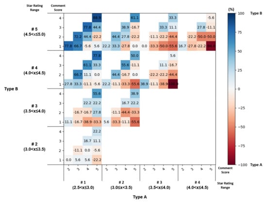 We collected 3600 selections (3600 selections = 36 participants × 2 groups × 50 selections) for 100 unique comparison scenarios. Each scenario was performed by 36 participants. Type A was selected 1745 times and Type B 1855 times, indicating that Type B was selected slightly more often. The overall trend is represented as a heatmap, shown in Figure 4. Each cell (comparison scenario) is composed of signed inter-rater reliability and indicates which type (Type A or Type B) of bias of the users. The darker the color, the more biased the selection is, and the lighter the color, the more contentious (evenly split) the selection is. The darker the red color, the more dominant Type A was for the comparison scenario; the darker the blue color, the more dominant Type B was for the comparison scenario. In general, a darker blue color appeared in the upper left quadrant and a darker red color appeared for the lower right quadrant. For example, when comparing a scenario with a SRR #5 and a CS of 3 (Type B) with a SRR #1 and a CS of 5 (Type A) (same as compared in Figure 2-Task1.), the participants chose Type B more and the inter-rater reliability at this time was +44.4%. In Figure 4, consider Type A (SRR #3, CS of 5) vs. Type B (SRR #4, CS of 1): the color is the darkest red, indicating a −100% inter-rater reliability score and that all participants chose Type A. There were 45 cells each biased for Type A and Type B. However, the median value of inter-rater reliability values was skewed for Type B (−22.2% for Type A, 33.3% for Type B). Therefore, Type B was chosen more predominantly. Both in terms of the number of choices and in terms of median values of inter-rater reliability, Type B has a slight predominance over Type A in general. Considering that Type B is a combination with a high star rating, when participants performed this task, they prioritized the star rating when making their decision. Therefore, when interpreting the results compared with the established assumption (H1), although the assumption prevailed, it was not acceptable in all cases. This result means that, when comparing two or more products and choosing one, the participants were more influenced by the quantitative review of a star rating.