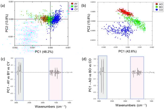 Principal component analysis of A, B, and C spectral populations of Y and O CC samples: (a,b) PCA scores plots in the 3050–900 cm−1 range and (c,d) corresponding PC1 loadings.