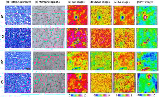 To pinpoint the topographical distribution of meaningful macromolecules, false color images were generated by integrating pre-processed IR maps under the following regions of interest (ROI): 3030–3000 cm−1 (stretching vibrations of =CH groups in unsaturated lipid alkyl chains; UNSAT); 3000–2800 cm−1 (stretching vibrations of CH2 and CH3 groups in saturated lipid alkyl chains; SAT), and 1700–1480 cm−1 (Amide I and II bands, representative of the vibrational modes of the peptide linkage in proteins; PRT). Different scales were adopted due to different IR absorbances displayed by the investigated macromolecules: black/blue colors indicated areas with the lowest absorbance values, while pink/white colors indicated areas with the highest ones (OPUS 7.5 software package, Bruker Optics, Ettlingen, Germany).