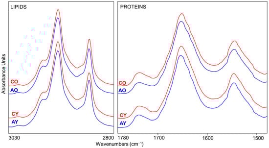In Figure 3, the IR spectra of representative regions of AY, CY, AO, and CO are displayed. Assignments of the most relevant bands were performed according to relevant literature [,,,,,] and taking into account the biological nature of the samples: in this light, bands were not merely related to chemical groups, but also the most represented biomolecules within tissue samples were taken into account, leading us to divide, as commonly accepted, the biological infrared spectrum into regions assigned to specific groups of molecules [,]. The most significant bands are as follows: ~3010 cm−1 (stretching vibration of =CH moiety in lipid alkyl chains); ~2956 cm−1 and ~2870 cm−1 (asymmetric and symmetric stretching vibrations of CH3 groups in lipid alkyl chains); ~2921 cm−1 and ~2850 cm−1 (asymmetric and symmetric stretching vibrations of CH2 groups in lipid alkyl chains); ~1735 cm−1 (stretching vibration of C=O ester moiety in fatty acids), and ~1650 cm−1 and ~1560 cm−1 (Amide I and II band of proteins).