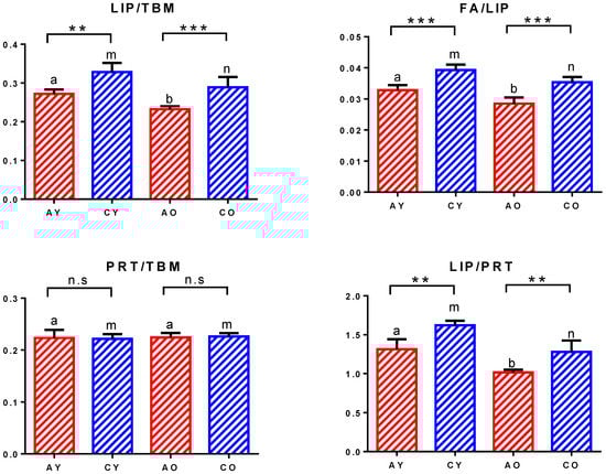 Statistical analysis of the macromolecular composition of A and C regions of Young and Old CC samples: LIP/TBM (total amount of lipids); FA/LIP (relative amount of fatty acids to lipids); PRT/TBM (total amount of proteins), and LIP/PRT (relative amount of lipids to proteins). Asterisks indicate statistically significant differences between A and C regions within the same group (n.s., p > 0.05; ** p < 0.01; *** p < 0.001). Different lowercase letters over histograms were used to indicate significant differences between Y and O groups (p < 0.05).