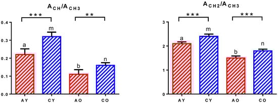To better elucidate the composition of the lipid fraction, the following band area ratios were investigated: ACH/ACH3 (calculated as the ratio between the areas of the peaks at 3010 cm−1 and 2956 cm−1), which was representative of the unsaturation degree in lipid alkyl chains; and ACH2/ACH3 (calculated as the ratio between the areas of the peaks at 2921 cm−1 and 2956 cm−1), which was representative of the saturation degree in lipid alkyl chains. From the statistical analysis of these ratios, which is shown in Figure 5, the following considerations can be drawn: (i) with regard to the ACH/ACH3, a higher degree of unsaturation was observed in Y than O CC samples (p < 0.05); furthermore, within each group, statistically significant higher amounts were found in CY than AY samples and CO than AO ones (p < 0.05); (ii) a similar trend was displayed by the ACH2/ACH3 ratio, with longer saturated alkyl chains in CY compared to CO CC samples, and in AY compared to CO samples (p < 0.05); within each group, higher values were found in C samples compared to A samples (p < 0.05).
